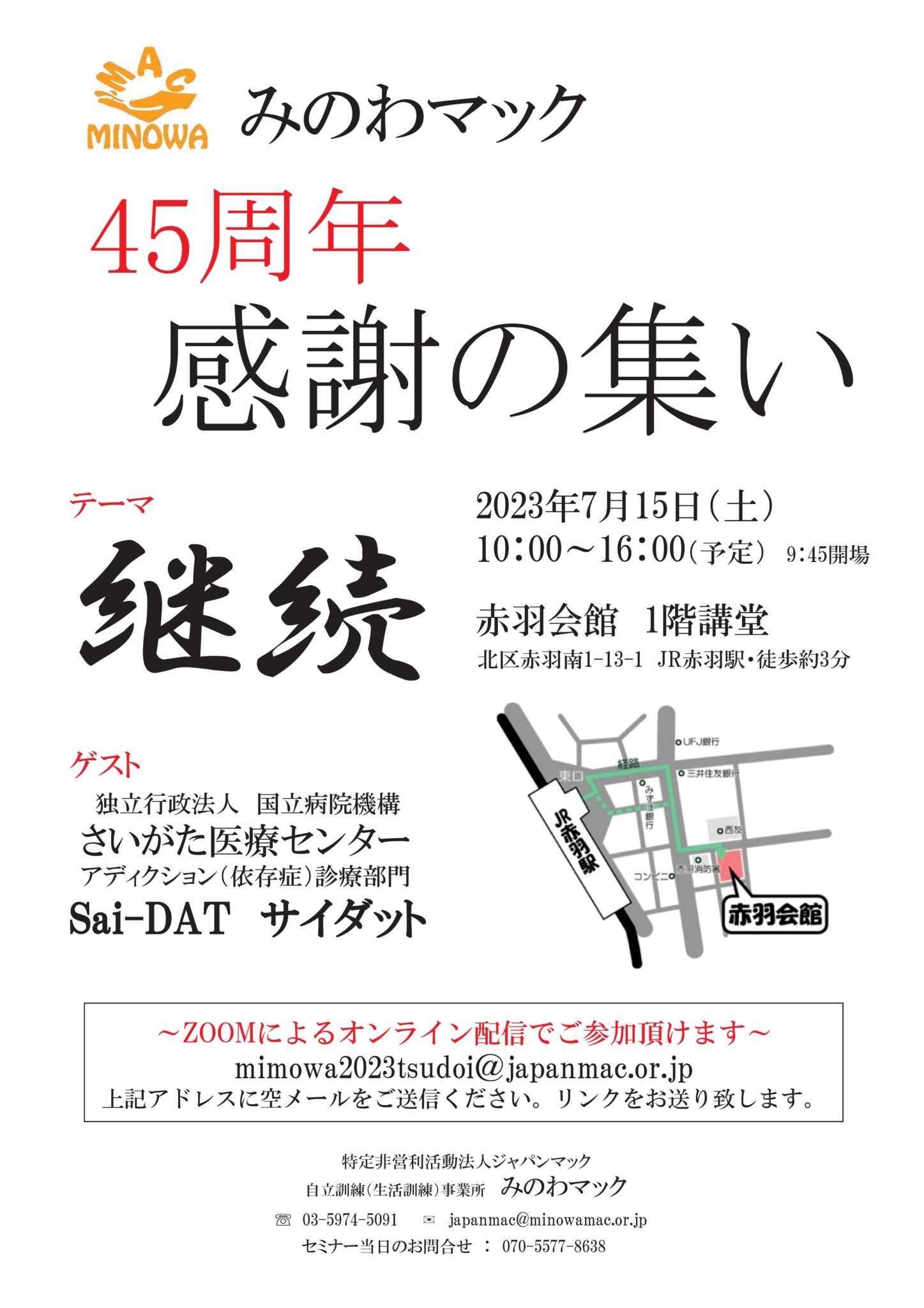 45周年感謝の集いminowamac2023年7月31日ニュース ゲストに、新潟のさいがた医療センター・アディクション(依存症)診療部門・ Sai-DAT(サイダット)をお招きして講演して頂きました。 7月15日(土)に、「みのわマック45周年感謝の集い」を赤羽会館で開催致しました。 当日は、会場に約230名様・オンラインで200名様強の方々にご参加頂きました。 多くの方々にご参加頂きましたことを心から感謝申し上げます。 前へ 投稿 MAC/DARCソフトバレーボール 次へ 投稿 江の島合宿