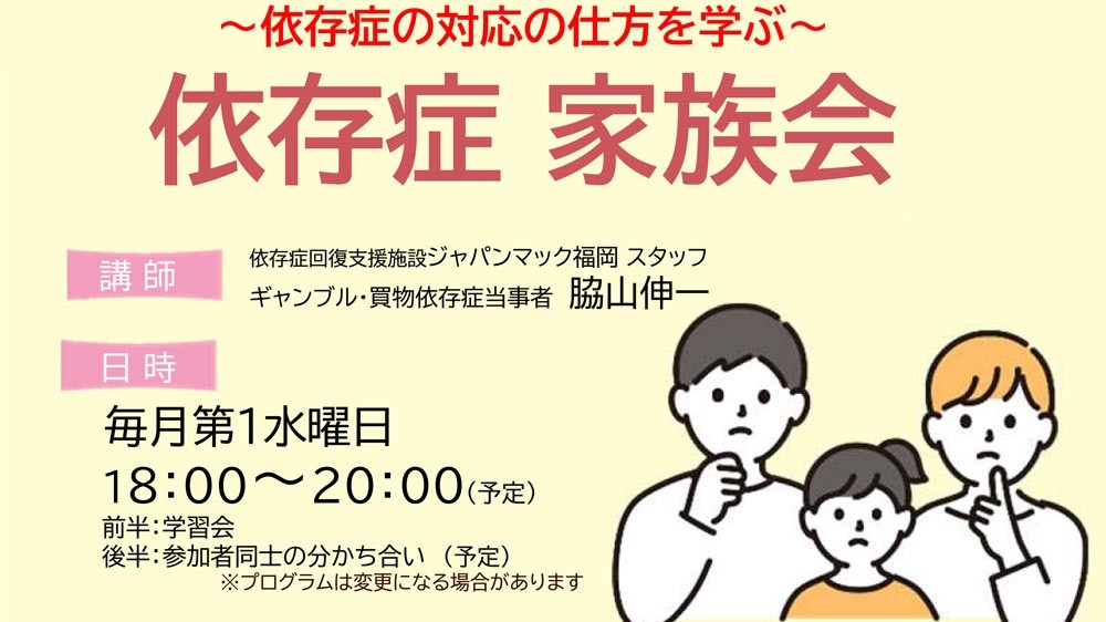 ジャパンマック福岡は、「依存症 家族会」を大牟田市で開催します。初回は10月1日(水)18:00〜20:00に行われ、以後は毎月第1水曜日に定期開催を予定しています。参加費は無料、ご予約も不要です。依存症回復支援施設のスタッフがご対応いたします。