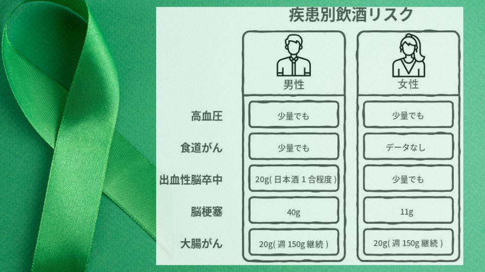 少量の飲酒でもリスクが上がる疾患があります。