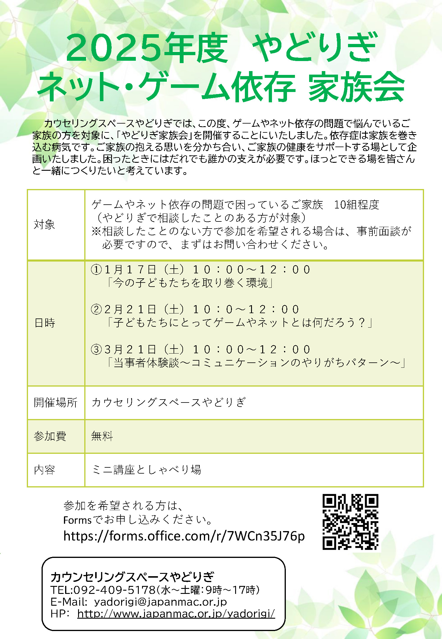 カウンセリングスペースやどりぎでは、2026年1月から3月の第3週土曜日に家族会を開催いたします。