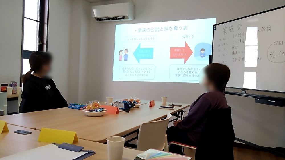 後半は、前半の講義に対する質問や、参加者同士での意見交換やわかちあいを行いました。講演を通して学んでいただくことも大切ですが、やはり家族会の良さは、参加された家族同士でわかちあい、共感し、「ひとりじゃない」と感じられるところだと思います。