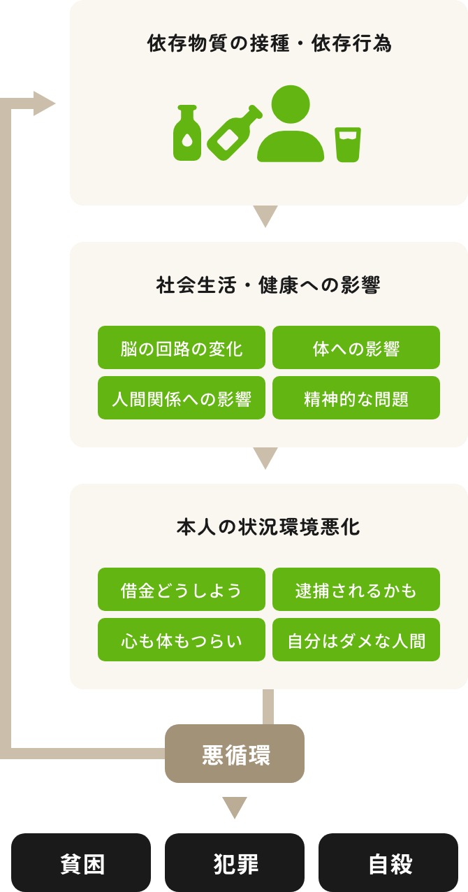 依存症は、量や頻度がだんだんと増えていく進行性の病気です。依存状態が進んでいくと、本人の体調や精神への影響にとどまらず、家族や周囲の人との関係性の悪化など日常生活に影響が及びます。最悪の場合貧困や犯罪、自殺などの社会的な問題にもつながります。