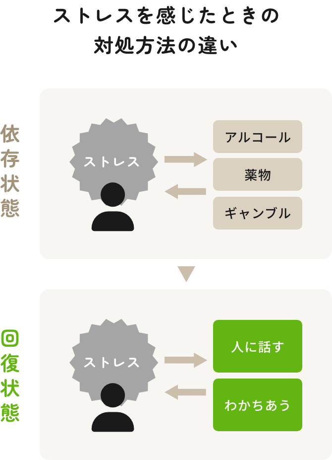 強い不安や孤独感を解消するために物質や行為に依存し、そこから依存症が始まる場合もあります。この背景から依存症は「孤独の病気」と呼ばれることもあります。